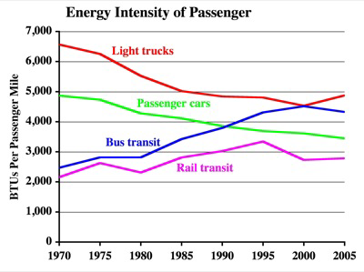 Since Lave wrote, the average energy efficiency of both passenger cars and light trucks has increased, a response to high fuel prices. Meanwhile, the average energy efficiency of both buses and rail transit have declined, probably because the transit industry has extended both bus and rail service to areas where they are little used. So what Lave wrote in 1979 is now more true than ever.